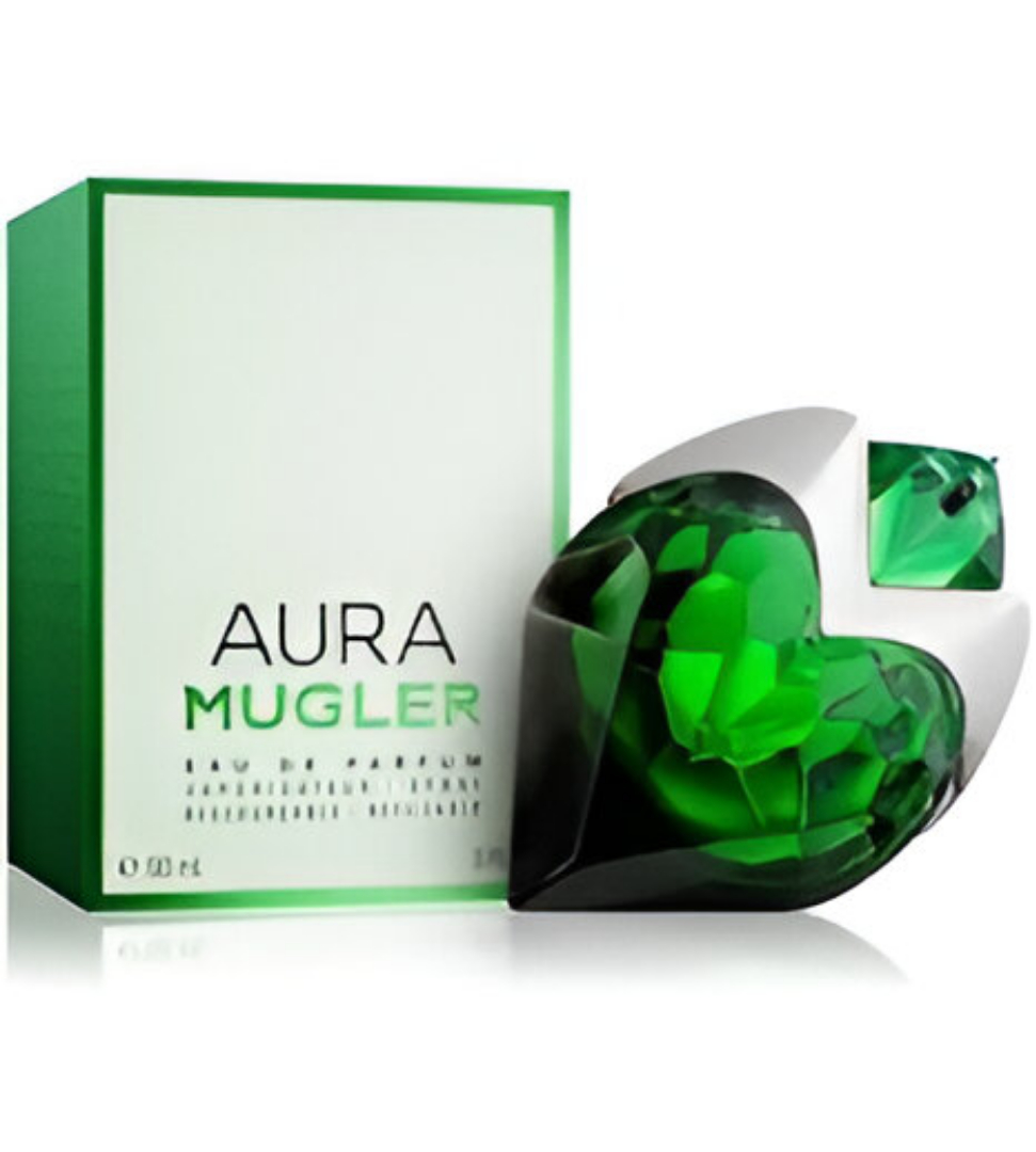 El perfume Aura Mugler Eau de Parfum (EDP) de 50 ml es una fragancia femenina de la familia olfativa Ámbar, conocida por su aroma herbal, verde y amaderado, que busca reconectar con el instinto y la naturaleza profunda. Es una fragancia polarizante y única, con una botella icónica en forma de corazón color esmeralda que es recargable