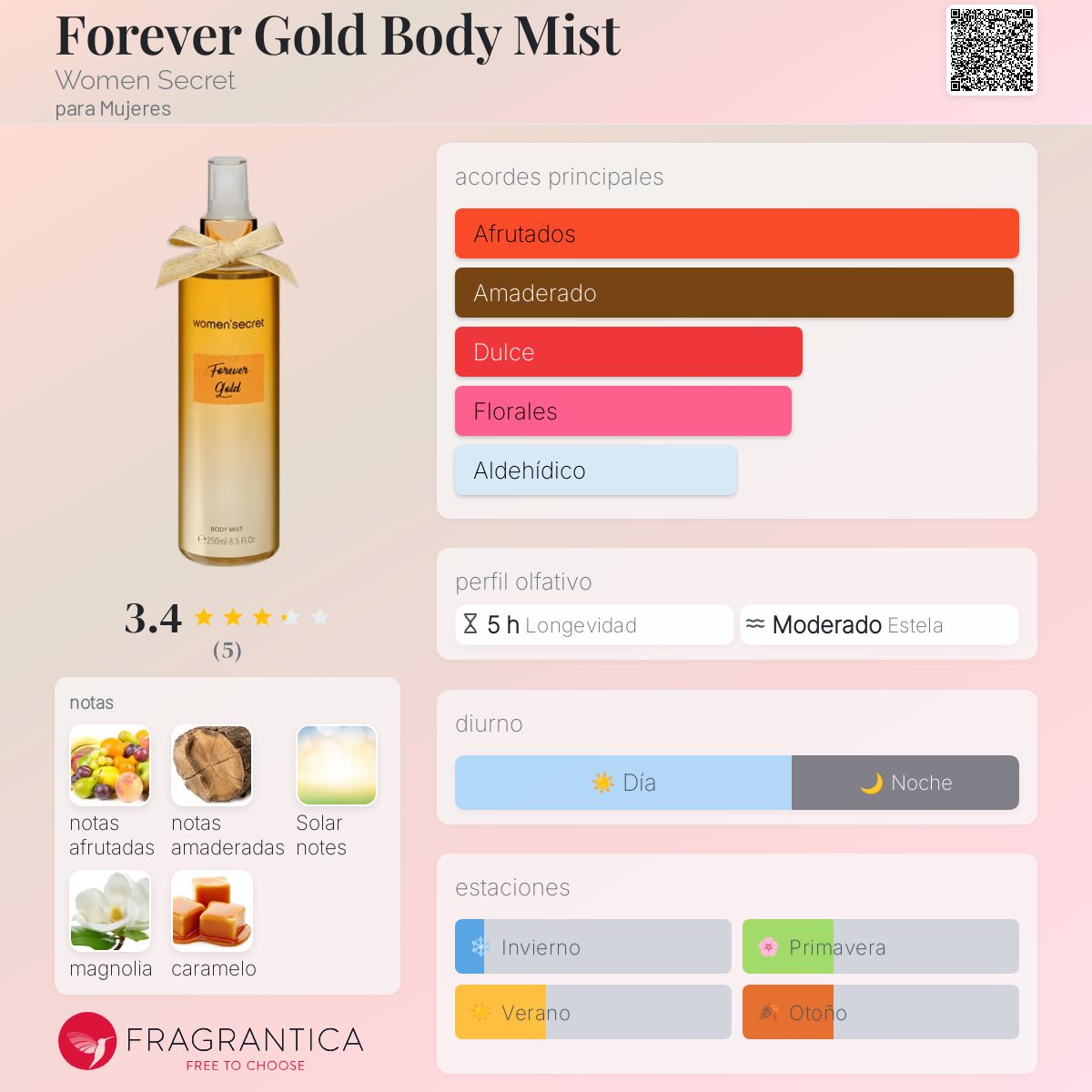 Forever Gold Body Mist de Women Secret es una fragancia de la familia olfativa Floral Frutal Gourmand para Mujeres.